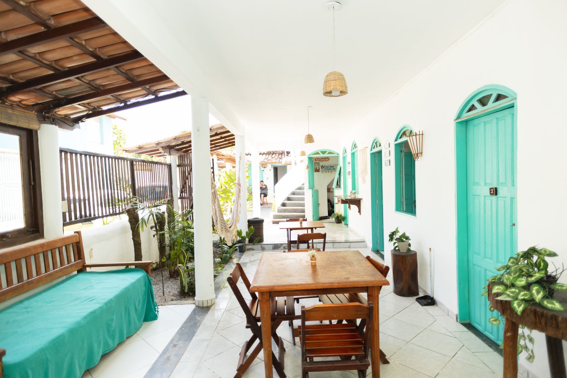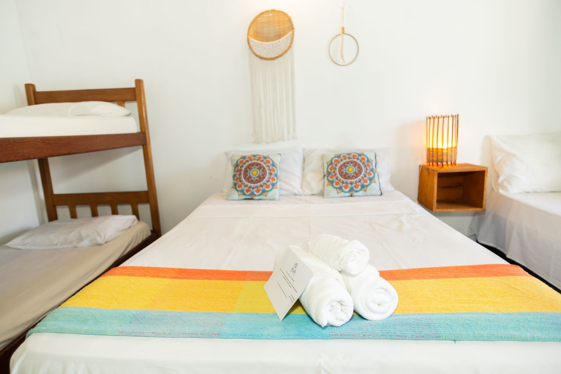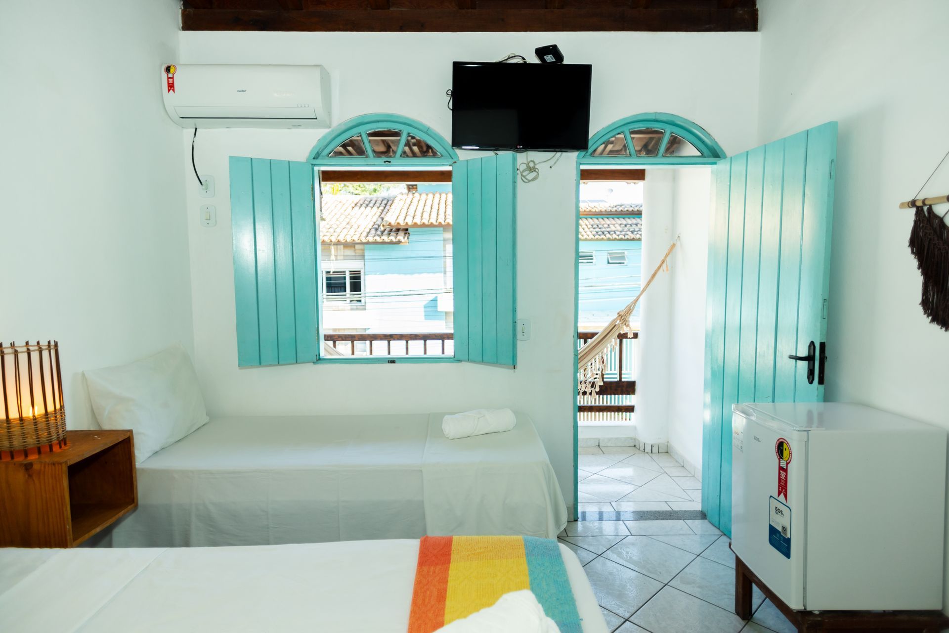 1 cama de casal, 1 de solteiro e 1 beliche. Dispõe de varanda com rede, ar-condicionado, TV, frigobar e banheiro privativo. Conforto e praticidade para momentos inesquecíveis em Arraial d’Ajuda.